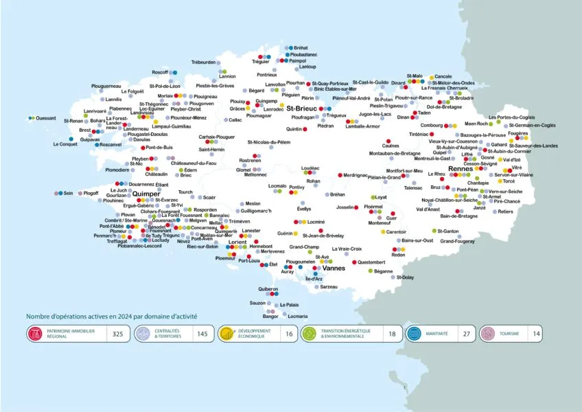 Notre mission est d’accompagner tous les territoires partout en Bretagne, des communes rurales aux grandes métropoles. La carte ci-dessous affiche les opérations orchestrées par nos équipes depuis 2020, par domaine d’activité : 325 opérations “Patrimoine immobilier régional”, 145 opérations “Centralités & territoires”, 16 opérations “développement économique”, 18 opérations “transition énergétique & environnementale”, 27 opération “Maritimité” et 14 opération “Tourisme”.