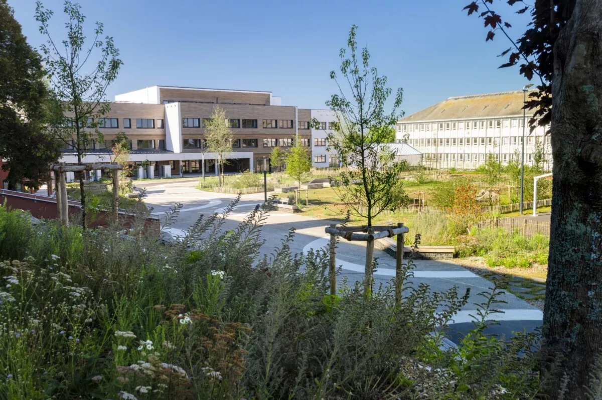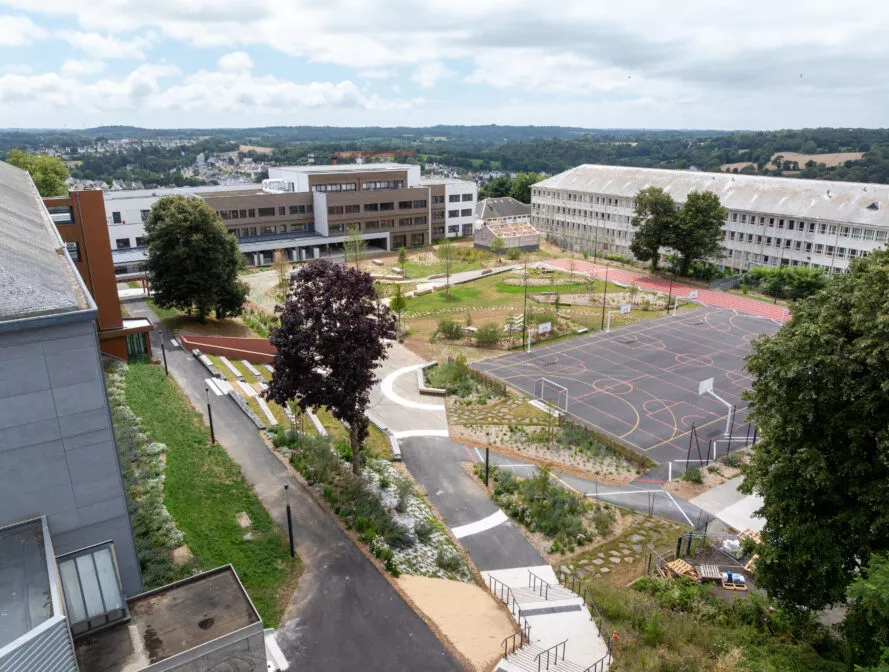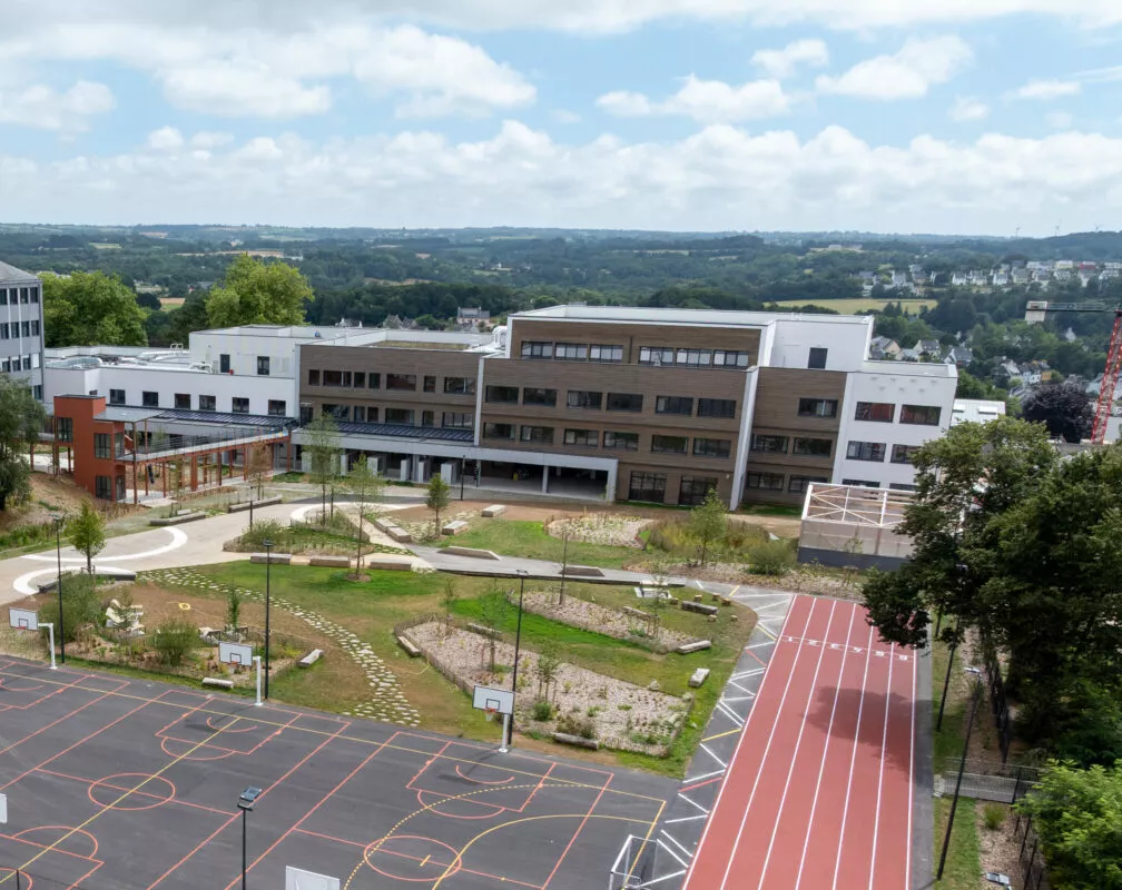 Soucieuse de réduire l’empreinte carbone de son patrimoine bâti, la Région Bretagne voulait saisir l’occasion d’optimiser l’emprise foncière occupée par l’établissement et reverdir les lieux. Au-delà de ses habituelles exigences en termes de fonctionnalité et de maîtrise des coûts, la Région a poussé plus loin ses ambitions en termes de qualité d’usage, de performances environnementales et de création d’un contexte favorables à la biodiversité. Le projet a été réalisé dans le cadre d’un marché global de performance (MGP).