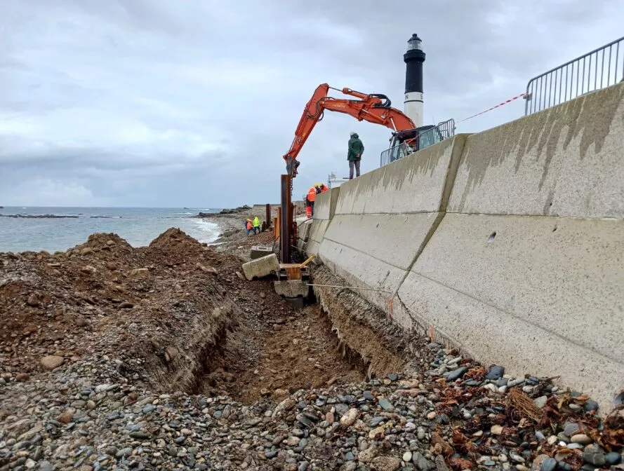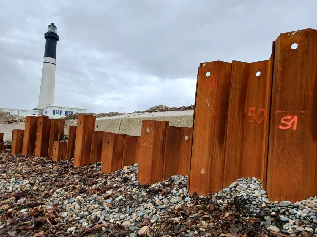 À la suite des grandes marées et vents violents survenus en mars 2023, la digue protégeant l’Ile de Sein, fragilisée depuis 2019, s’est effondrée. Cet effondrement mettait en péril plusieurs équipements majeurs de l’île : un site de désalinisation d’eau de mer assurant l’alimentation en eau potable de l’ile, des groupes électrogènes et une écloserie à homards.